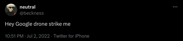 The tell was there three years ago, in a throwaway tweet that felt like absurdist humor: “Hey Google drone strike me.”