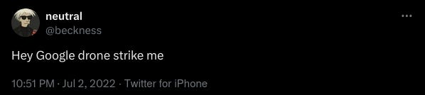 The tell was there three years ago, in a throwaway tweet that felt like absurdist humor: “Hey Google drone strike me.”